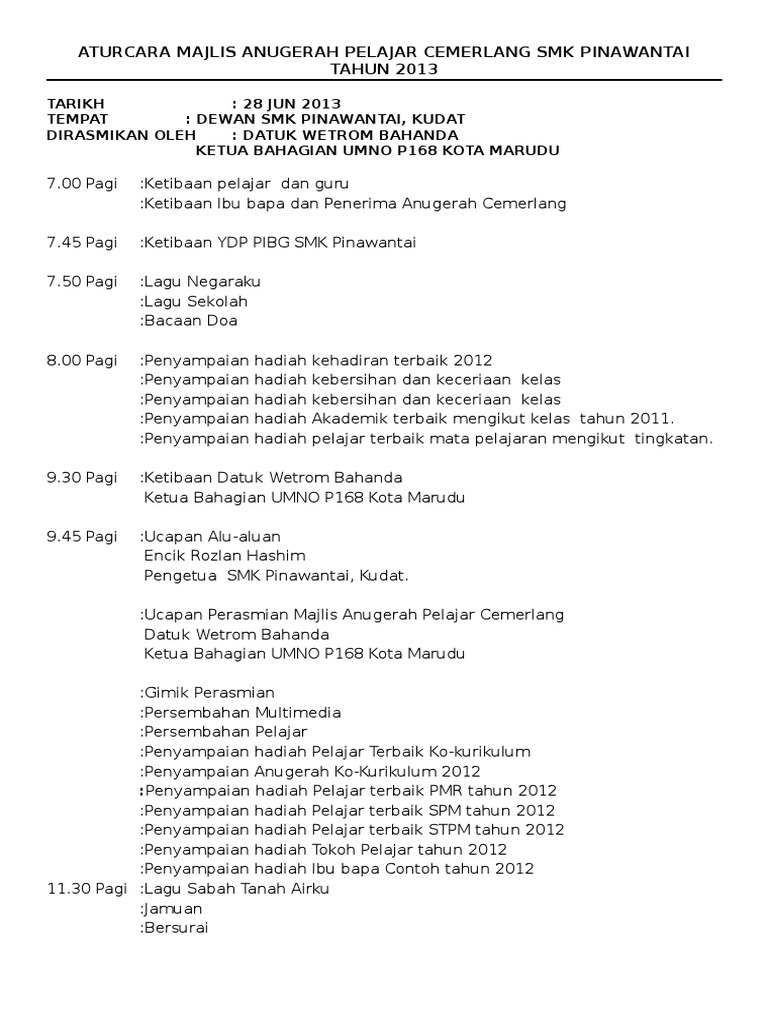 Majlis konvensyen kumpulan kerja cemerlang. Look through examples of majlis translation in sentences, listen to pronunciation and learn grammar. Aturcara majlis, tentatif program sambutan hari guru, tentatif program hari guru, tentatif sambutan hari guru, aturcara majlis pertunangan. Aturcara majlis hari anugerah sksm 2014 8.30 pagi kehadiran ibubapa 8.45 pagi ketibaan vip 9.00 pagi ucapan aluan pengerusi majlis bacaan al quran ucapan guru besar (tuan haji mohd bin ali) ucapan ydp pibg (en muhammad shukry bin m. The top queries driving traffic to www.aturcaramajlis.com from search engines.