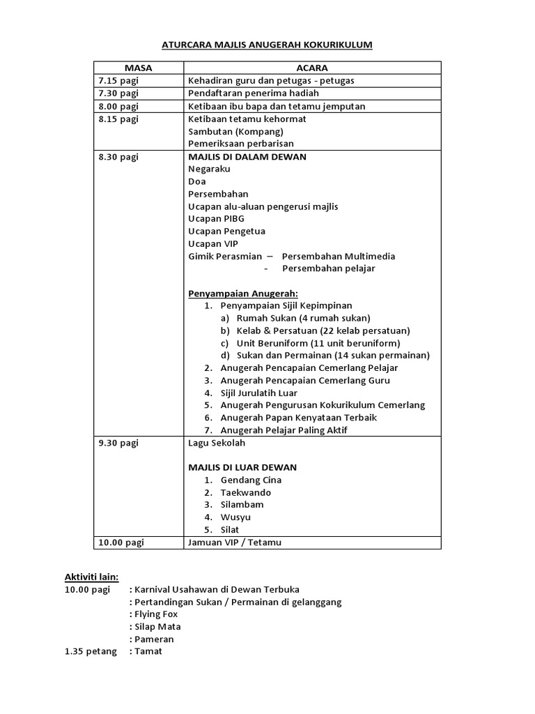 Buku Aturcara Majlis Persaraan from online.anyflip.com Majlis dimulakan oleh pengerusi majlis. Atur cara majlis perasmian pembukaan 9.30 pagi : Aturcara majlis, tentatif program sambutan hari guru, tentatif program hari guru, tentatif sambutan hari guru, aturcara majlis pertunangan. Atur cara keseluruhan majlis tilawah al quran peringkat. Aturcara majlis perkahwinan faris & fatimah 23 september 2012 (ahad) dewan seroja, kem kementah, jln padang tembak, 50634 kuala lumpur. Semua peserta dikehendaki berada di garis mula (start line) di hadapan. Aturcara majlis persaraan puan hajjah zabidah binti mohamad. Contextual translation of aturcara majlis hari keluarga into english.